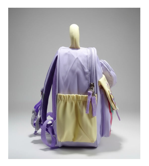 Crafted from durable and washable material, this lightweight backpack is easy to clean and built to last. It comes with one spacious main compartment, one small front pocket, and two side pockets—ideal for carrying snacks, toys, water bottles, and other essentials. Please note, this bag is not suitable for keeping books, making it a great choice for toddlers and younger kids.