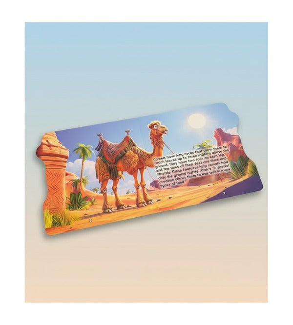 With 15 colorful pages written in simple English, the story introduces children to the camel, an animal mentioned in the Quran, reflecting Allah’s greatness and power. The unique camel-shaped design makes reading even more enjoyable, while vivid illustrations keep children engaged and help strengthen their faith and knowledge.