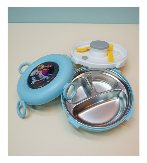 Frozen Anna & Elsa Round Shaped Stainless Steel Lunch Box – Three Portions, Spoon & Fork, 6.5x6.5 inches (KH31-14)