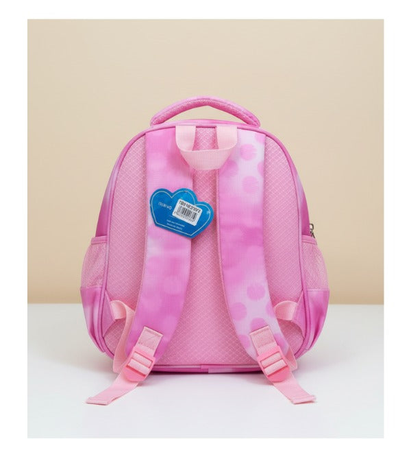 The bag offers one spacious main compartment for books and toys, two front zip pockets for small accessories, and two side pockets for water bottles or snacks. Designed for comfort, it comes with adjustable padded shoulder straps and is made from durable, lightweight, and washable material — perfect for everyday use.