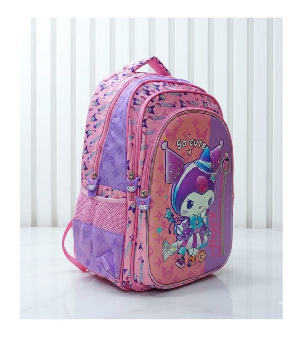 Featuring a charming 3D Kuromi design, this backpack stands out with its adorable look and vibrant detailing. It offers one spacious main compartment, two small compartments, and two side pockets — perfect for keeping books, notebooks, lunch boxes, stationery, and a water bottle organized. Crafted from high-quality, washable, and durable material, this Kuromi school bag is built to last and easy to clean.