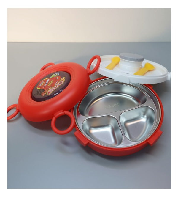 McQueen Round Shaped Stainless Steel Lunch Box – Three Portions, Spoon & Fork, 6.5x6.5 inches (KH31-14)