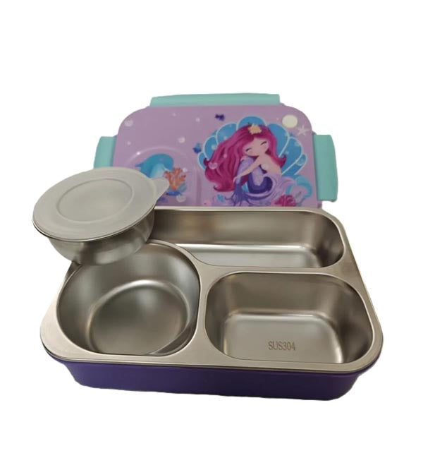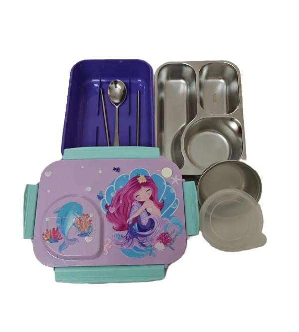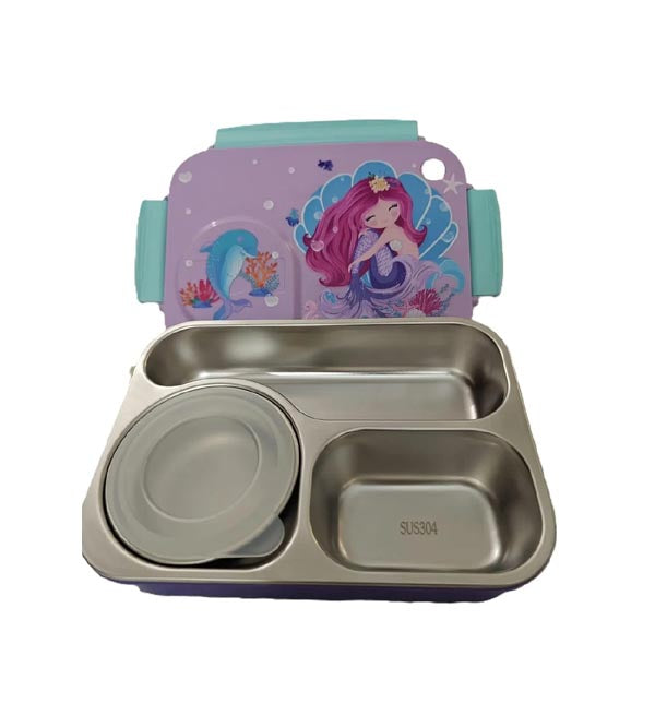 Mermaid Stainless Steel Lunch Box | 3 Portion Bento Box with Spoon, Chopsticks & Container (2659)