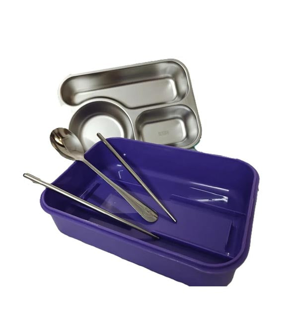 Made from durable stainless steel, it features three sealed compartments to keep food fresh and separated throughout the day. The four sturdy side locks provide leak-proof protection, making it safe to carry in school bags without spills. This lunch set also includes a round-shaped container, a stainless steel spoon, and stainless steel chopsticks – offering complete convenience for kids.