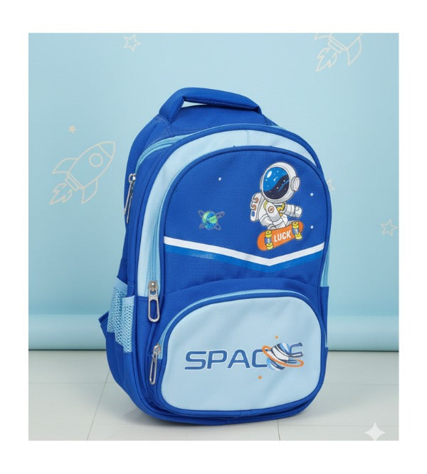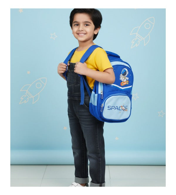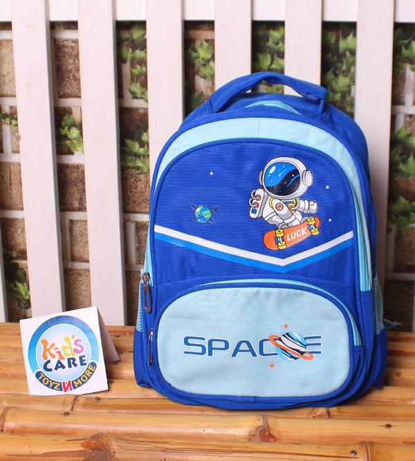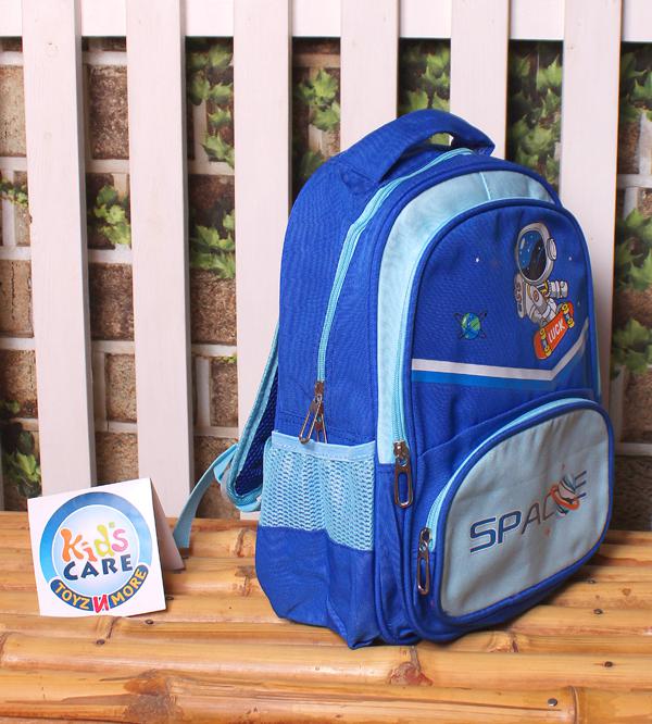 Keywords: Backpack, School bag, Travel backpack, Space World, Astronaut, Royal blue, Playgroup, Kindergarten, KG 1, KG 2, One main compartment, Small compartment, Two side pockets, Adjustable straps, Comfortable, Durable, Washable, Cash on delivery, Pakistan.