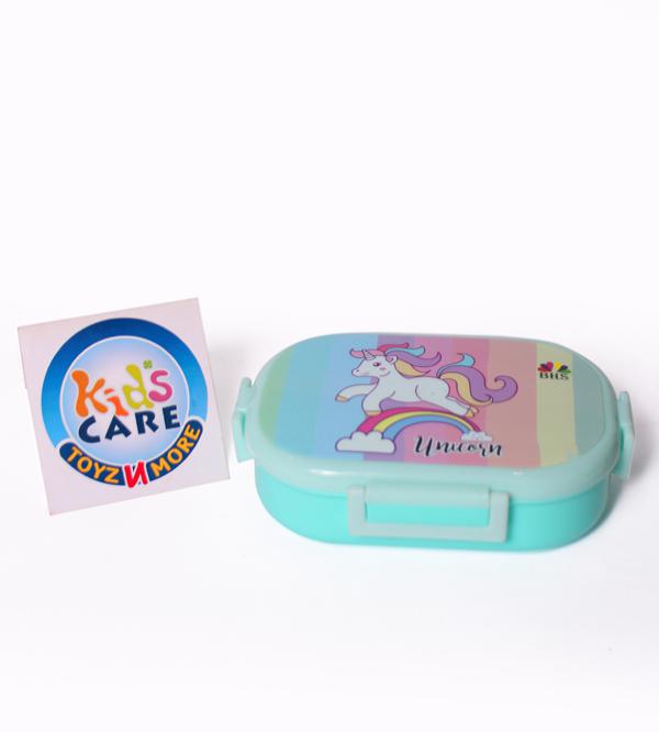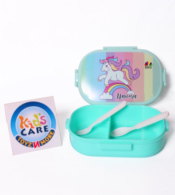 Order your Unicorn Themed 7.5x5-Inch Two Portion Lunch Box with Spoon, Fork and Four Side Locks today.