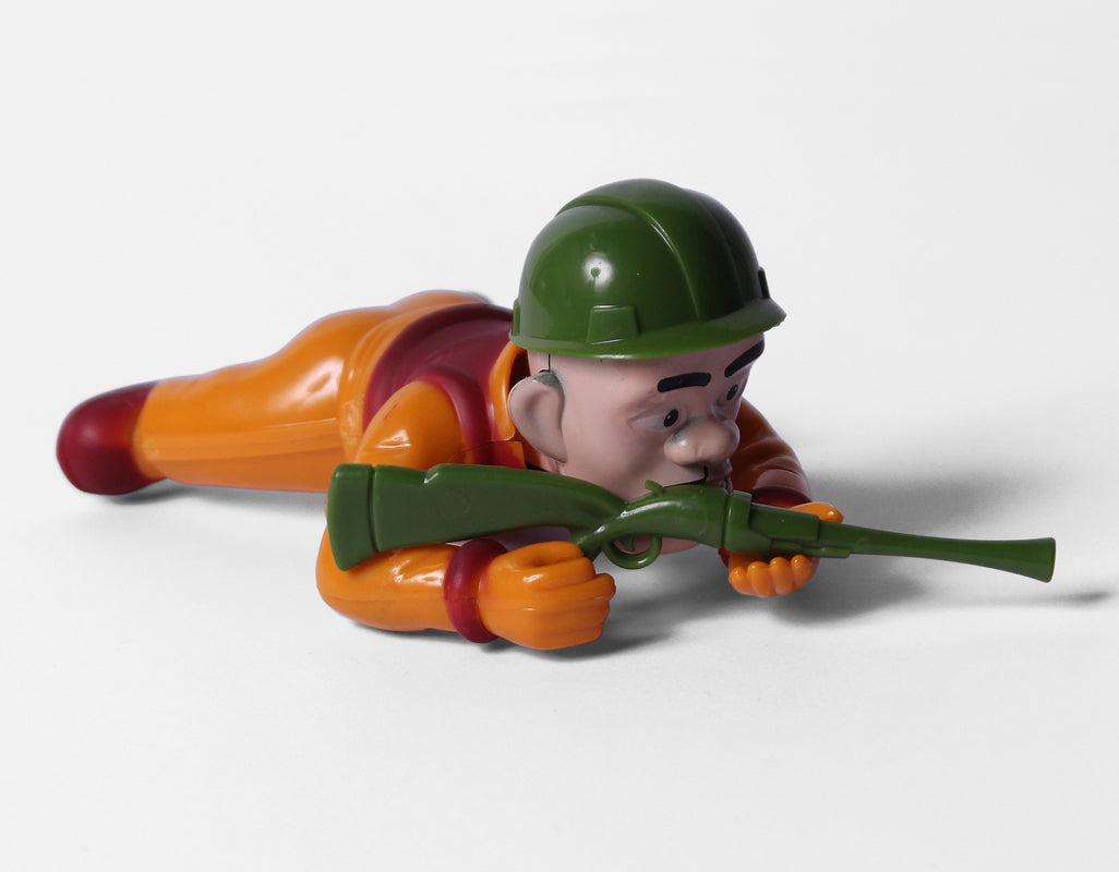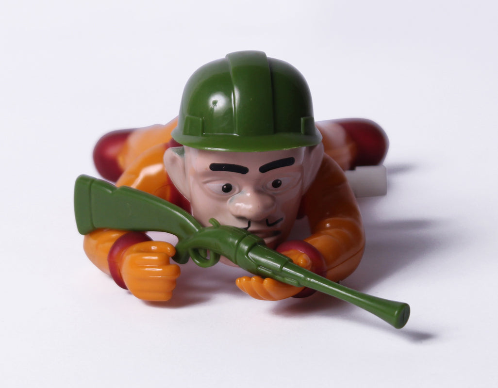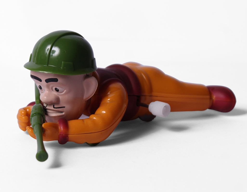 The Crawling Army Soldier crawls on his belly as he aims his rifle. Wind up Army Man wiggles legs as he crawls across the forest or your desk in his camouflage uniform.